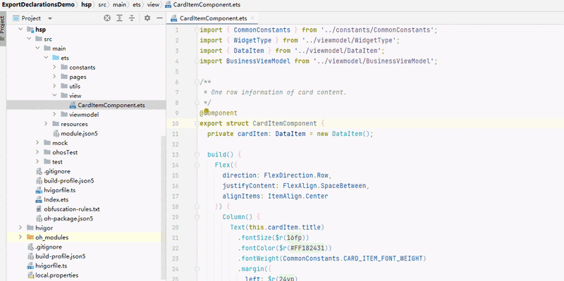 编辑器支持将HSP和HAR模块中变量、方法、接口、类等需要对外暴露的信息,通过Generate...>Declarations功能,批量在Index.ets文件中进行声明,便于其他模块调用。
