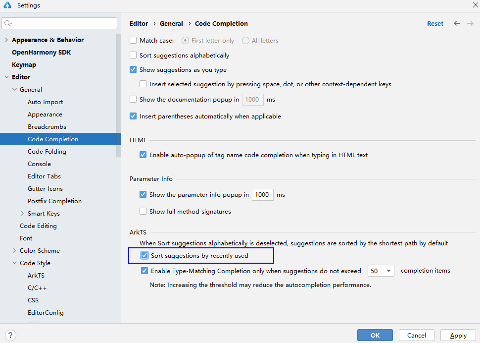 自动补全功能默认按最短路径进行排序,如仅需按照最近使用过的类、方法、字段和关键字等名称提供补全内容排序,可以在File > Settings(macOS为DevEco Studio > Preferences/Settings) > Editor > General > Code Completion 中勾选“Sort suggestions by recently used”。