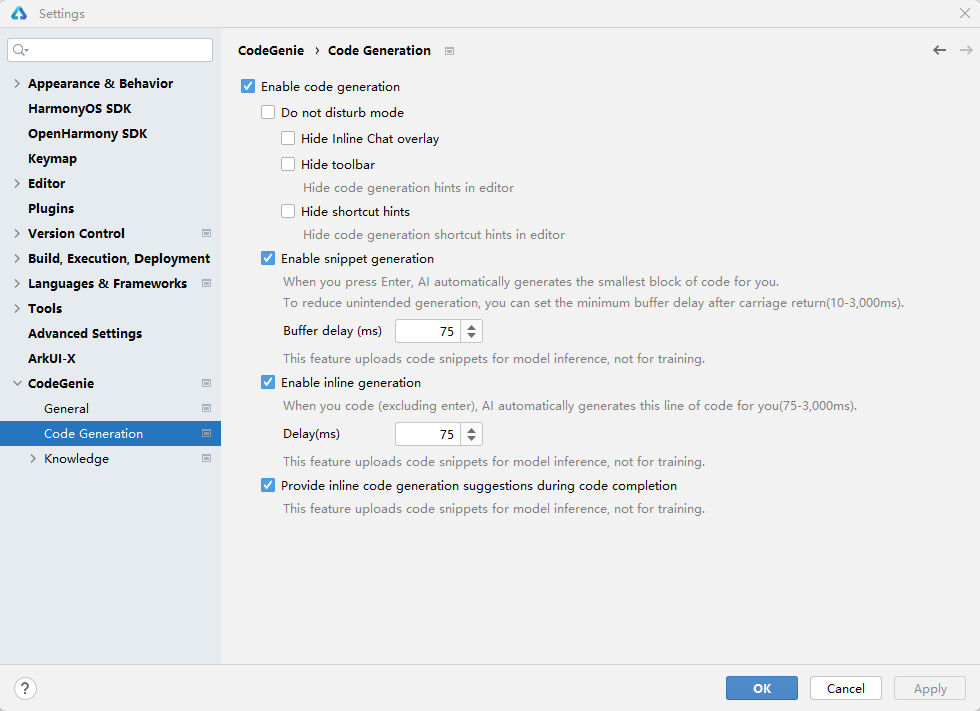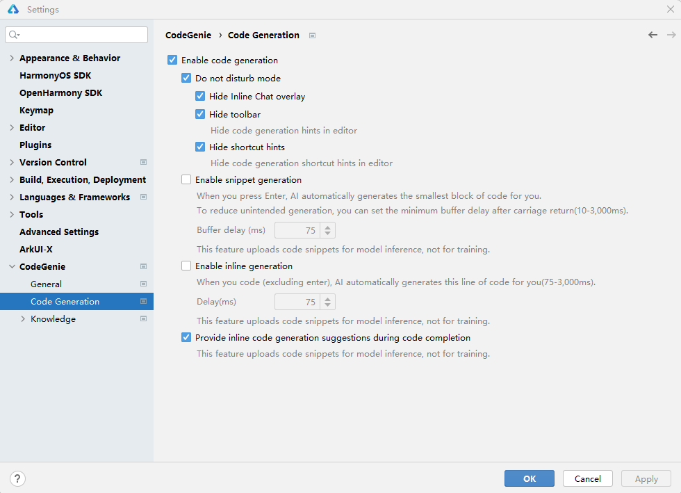 进入File > Settings...(macOS为DevEco Studio > Preferences/Settings)> CodeGenie > Code Generation页面勾选Enable code generation,开启代码续写功能。如果已经熟悉了CodeGenie常用的快捷键,想要更加沉浸的体验,可以在该页面勾选Do not disturb mode,隐藏代码生成工具栏及快捷键提示。