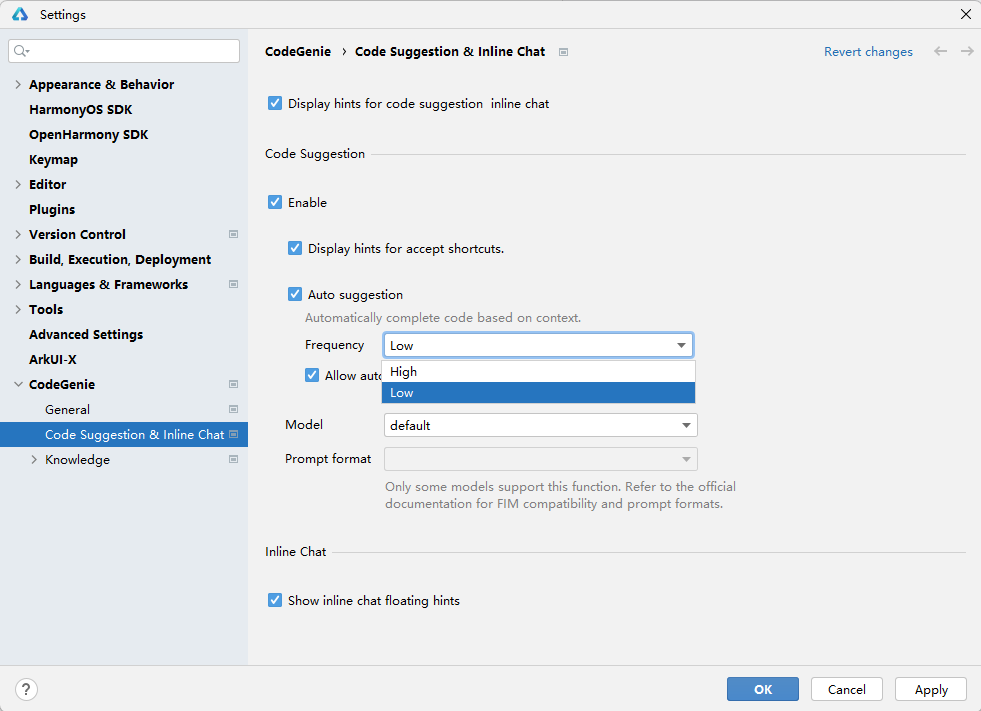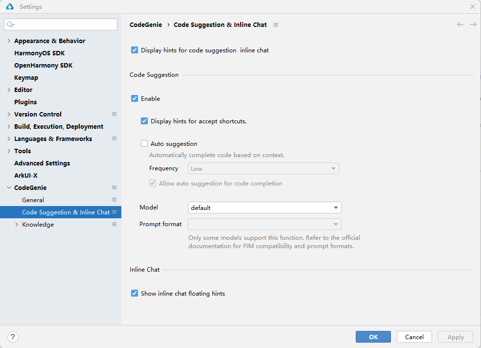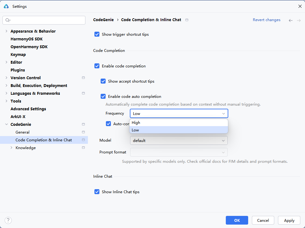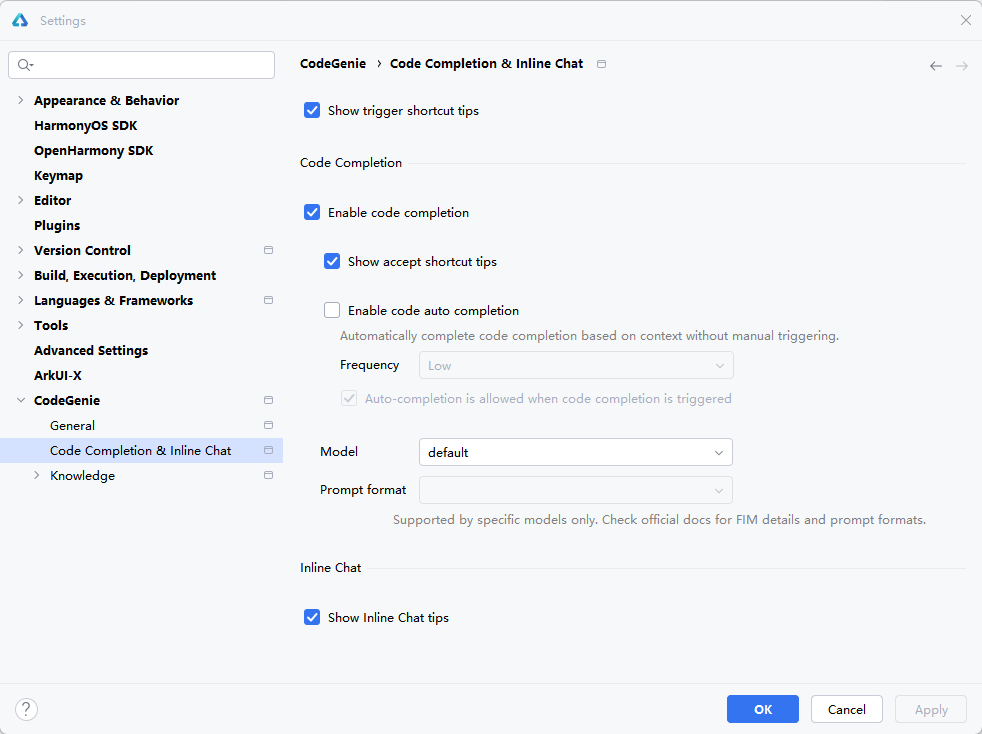 进入File > Settings...(macOS为DevEco Studio > Preferences/Settings)> CodeGenie > Code Completion & Inline Chat页面进行设置,若没登录华为开发者账号请先登录。