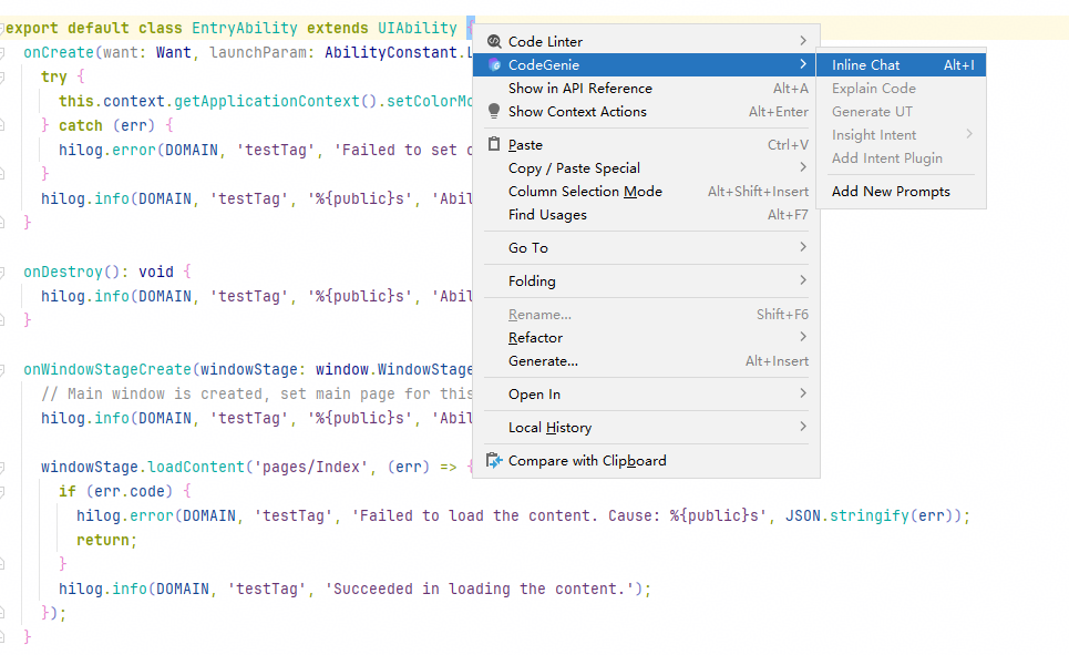 若未选中代码片段,在代码编辑区域右键选择CodeGenie > Inline Chat(或使用快捷键Alt+I,macOS中为Command+I)。