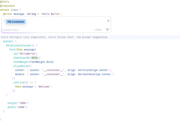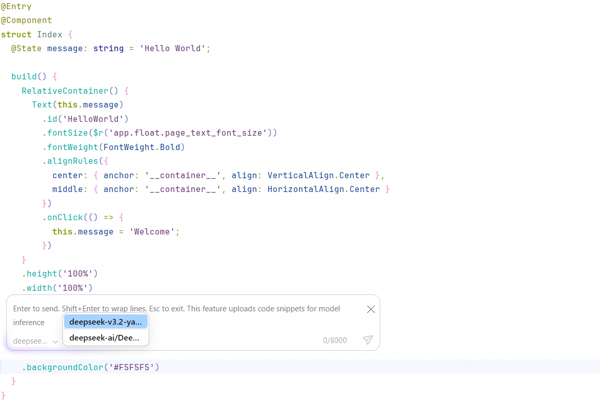 从DevEco Studio 6.0.2 Beta1开始,Inline Edit支持选择三方模型,根据指定的模型进行生成代码。
