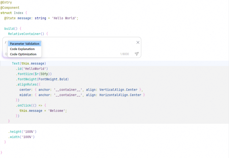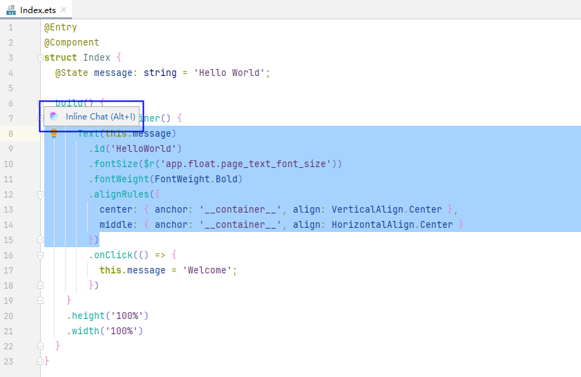 CodeGenie提供Inline Edit能力,支持在ArkTS文件的编辑窗口中通过自然语言进行问答,基于上下文智能生成代码片段,提升代码可读性。