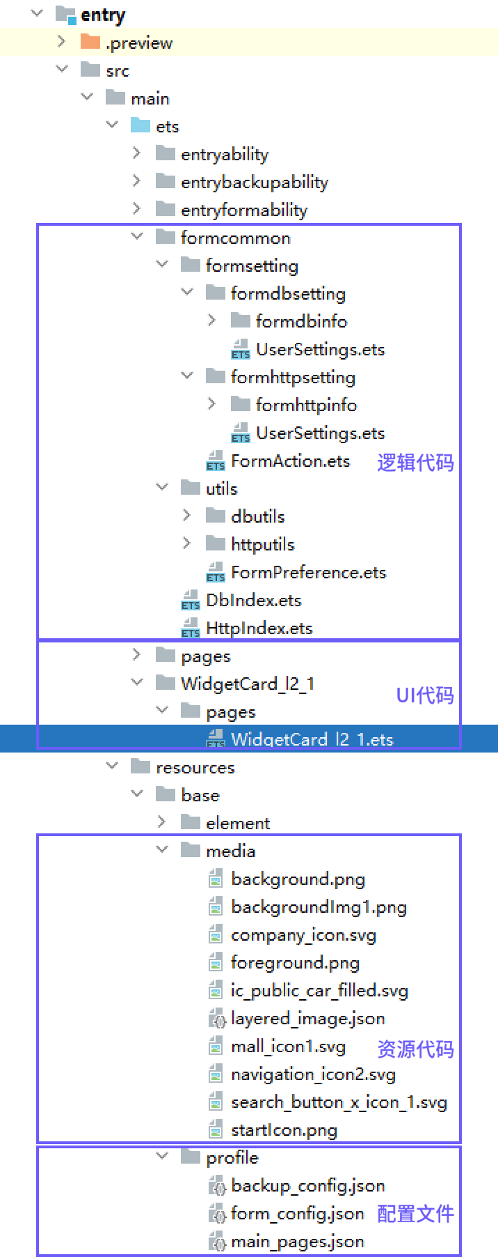 - formhttpsetting > formhttpinfo:存放包含卡片信息的Info.ets文件,可在Info.ets文件中添加获取卡片刷新数据的URL。