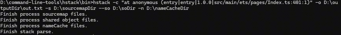 # 通过-i指定crash文件归档目录,并将解析结果输出至outputDir目录hstack -i D:\crashDir -o D:\outputDir -s D:\sourcemapDir --so D:\soDir -n D:\nameCacheDir# 通过-c指定一条堆栈,并将解析结果输出至out.txt文件hstack -c "at anonymous (entry|entry|1.0.0|src/main/ets/pages/Index.ts:401:1)" -o D:\outputDir\out.txt -s D:\sourcemapDir --so D:\soDir -n D:\nameCacheDir