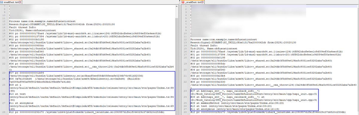 如果是指定crash文件归档目录,解析完成后,outputDir目录下会生成对应的解析结果,文件以原始crash文件名加“_”前缀进行命名。crash堆栈中的C++日志以及ArkTS日志均已解析为源码对应的文件路径以及行列号,结果如下图所示: