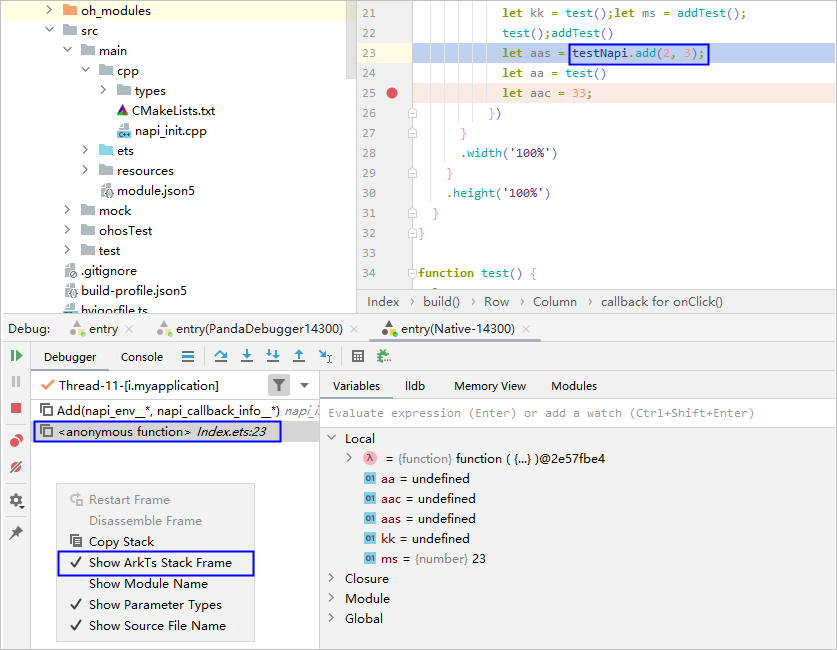 进入到C++代码后,可以从左下角Frames区域查看C++的调用栈,如需查看对应的ArkTS调用栈,在Frames区域中单击鼠标右键,勾选****Show ArkTs Stack Frame。****点击调用栈可以跳转到对应的代码行。