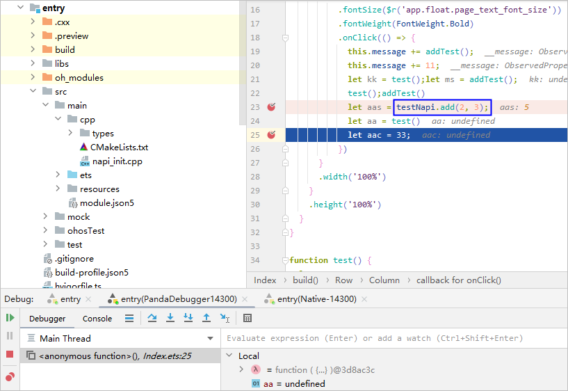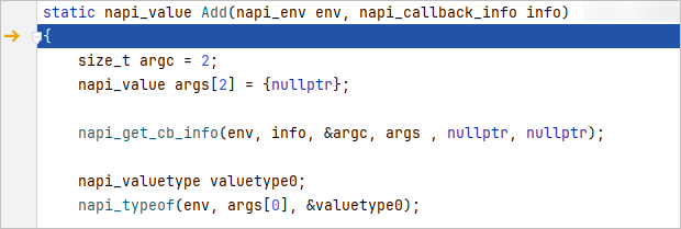 代码调试执行到ArkTS调用C++方法处,点击Step Into可以进入到对应的C++方法的第一行代码处。