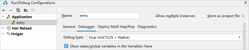 在菜单栏单击Run > Edit Configurations,选择Application下的模块名(如entry),然后在右侧窗口中选择Debugger,将Debug type设置为“Dual(ArkTS/JS + Native)”。