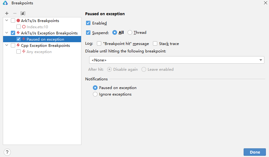 在BreakPoints中,勾选ArkTS/Js Exception Breakpoints,开启异常断点。