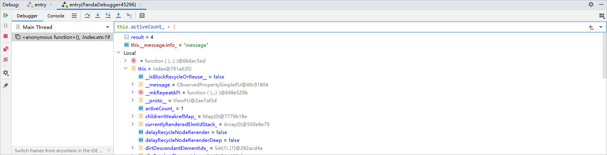 当应用停止在某个断点处时,您可以在"Debugger"窗口中查看当前的变量信息。在"Frame"窗格中选择某个帧之后,可以在"Variable"窗格中检查变量,或对变量进行计算。