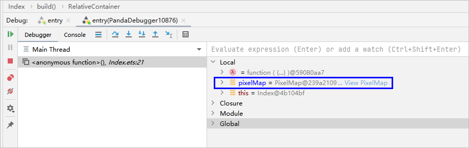 从DevEco Studio 6.0.2 Beta1版本开始,支持预览pixelMap类型的变量。点击pixelMap变量右侧的View PixelMap,即可预览pixelMap。