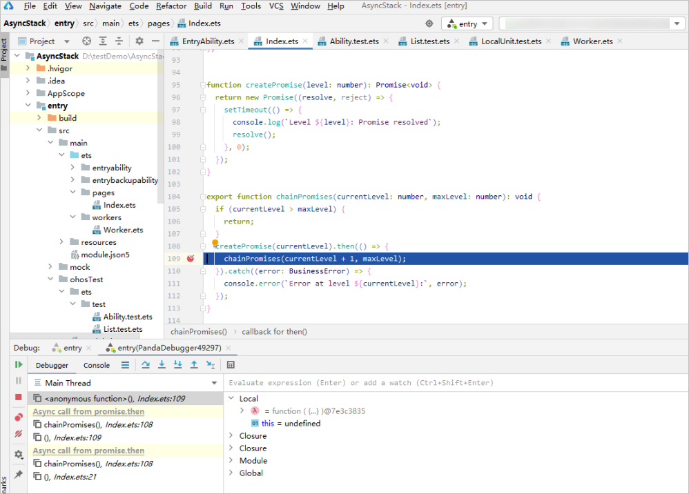 从DevEco Studio 5.1.1 Beta1版本开始,开发者可通过打开异步堆栈跟踪开关、设置异步调用链深度来跟踪异步函数调用的顺序。