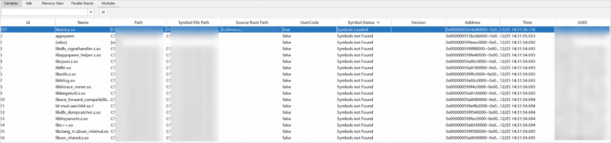 在native调试期间,Modules窗口会列出并显示有关应用使用的so信息。点击各属性可按升序/降序来排序,支持字符串匹配搜索。