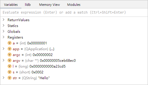 调试时,在“Variables”页面查看变量,支持查看全局/静态变量、寄存器变量和局部变量。