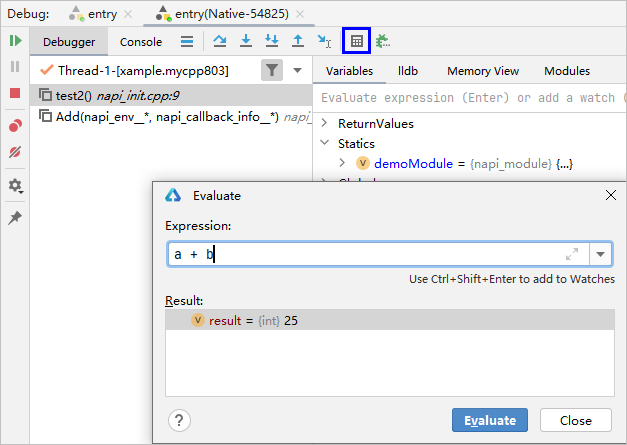 通过点击“Evaluate Expression...”按钮,或Watches 页面中的输入行中,输入表达式进行计算。