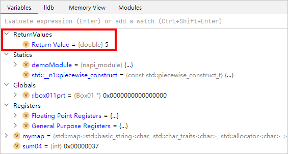 当使用“Step Out”从一个函数内步出后,变量列表中的“ReturnValues”会展示所步出函数的返回值。