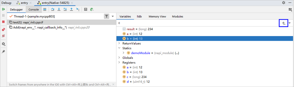 在菜单栏点击“File > Settings(macOS为DevEco Studio > Preferences/Settings) > Build, Execution, Deployment > Debugger > C++ Debugger”,通过勾选“Display STL variables as visualization in the Variables Pane”在变量列表中展示简化后的 STL 变量值,或去掉勾选以展示其原始结构。