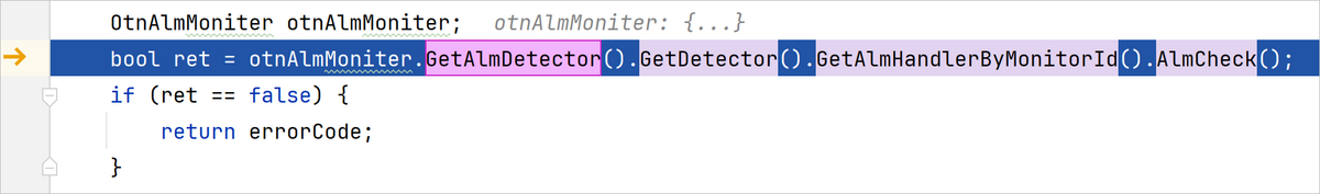 工具编写与调试应用应用调试代码调试Native代码调试智能步入本页总览智能步入 进行C++调试时,当前代码行有多个函数调用时,开发者可以使用Smart Step Into功能直接Step Into到其中某一个函数的实现中。 操作步骤 通过点击调试窗口“entry-Native”调试器下的Debugger窗格中的按钮(或使用快捷键Shift+F7)触发Smart Step Into功能后,DevEco Studio会将当前代码中可以进行跳转的函数进行高亮显示。 开发者点击需要跳转的函数,程序会运行到目标函数的实现内。 已经执行完毕的函数不会高亮显示。