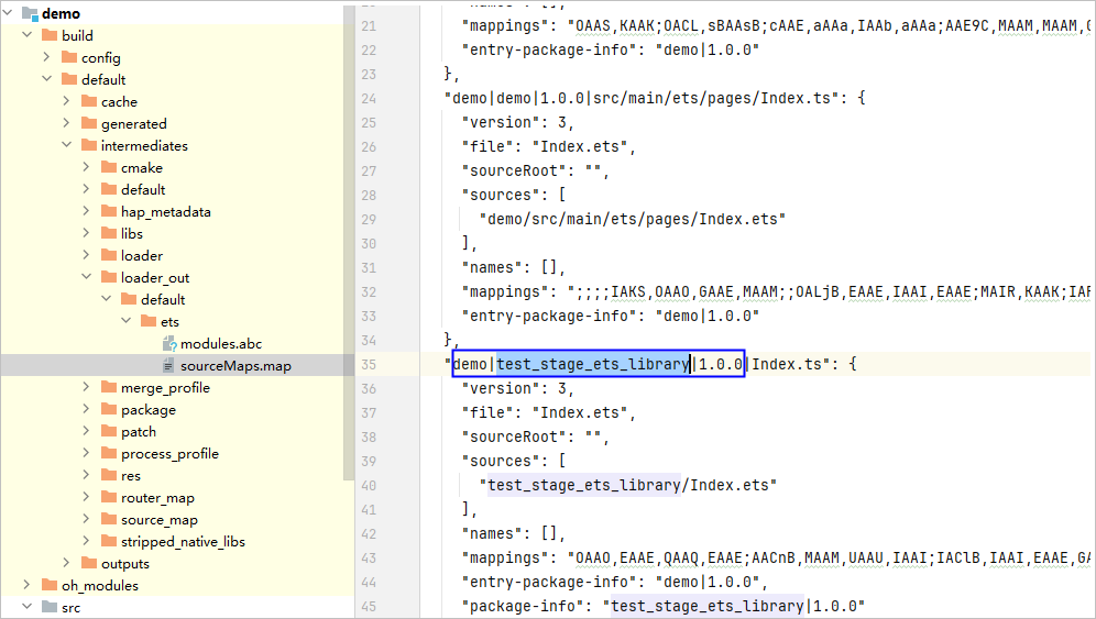 构建HAR包工程,打开主模块的sourceMap,根据HAR的oh-package.json5中的name进行查找,将Index文件的前缀路径记录为localUrl,例如以下的demo|test_stage_ets_library|1.0.0。