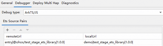 点击Run > Edit Configurations > Debugger > Ets Source Pairs,点击****+,填写前两个步骤获取到的remoteUrl和localUrl****。
