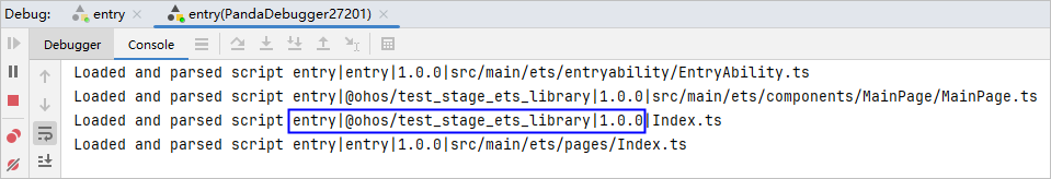 主工程应用在设备上运行起来后,在HAR包工程中通过attach方式对该应用进行调试,在Debug窗口获取程序加载时的前缀,记录为remoteUrl,例如以下的entry|@ohos/test_stage_ets_library|1.0.0。