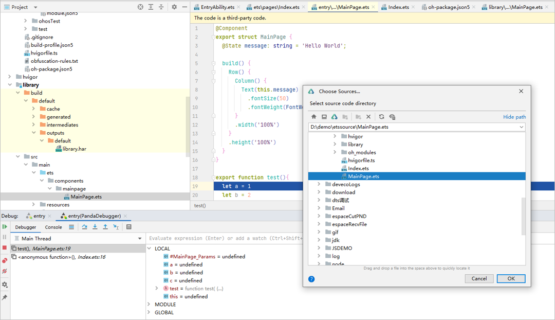 导入成功后,由于debug模式编译的字节码HAR中包含sourceMap,调试时默认会关联当前工程的源码,此时可以在HAR模块上直接添加断点。