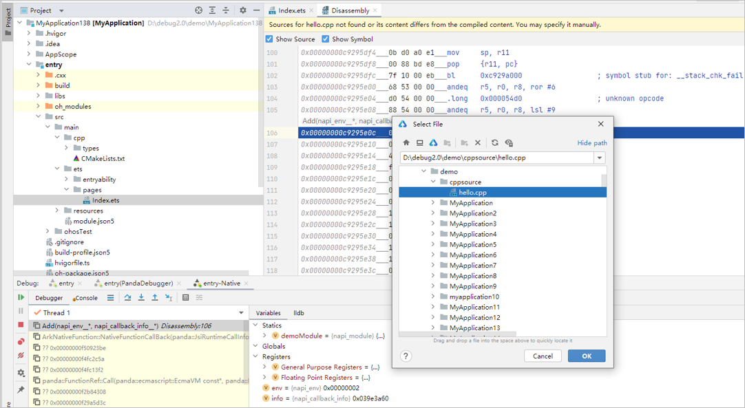 DevEco Studio调试应用时会优先加载配置的so文件,本地so文件包含调试信息时,可以正常调试源码。由于so的源码文件信息为编译时的文件路径,若与本地的源码文件路径不一致时,需要关联源码文件,有两种方式: