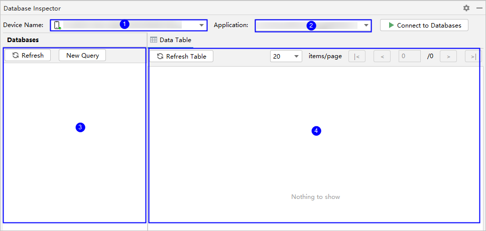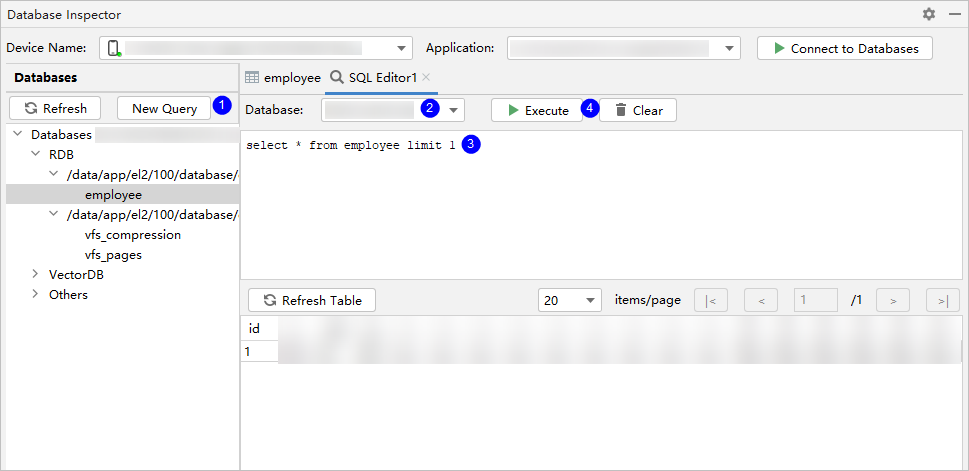Database Inspector打开后,页面各区域作用如下:①选择设备,②选择应用包名,③数据库和表信息展示,④SQL执行和数据查看。
