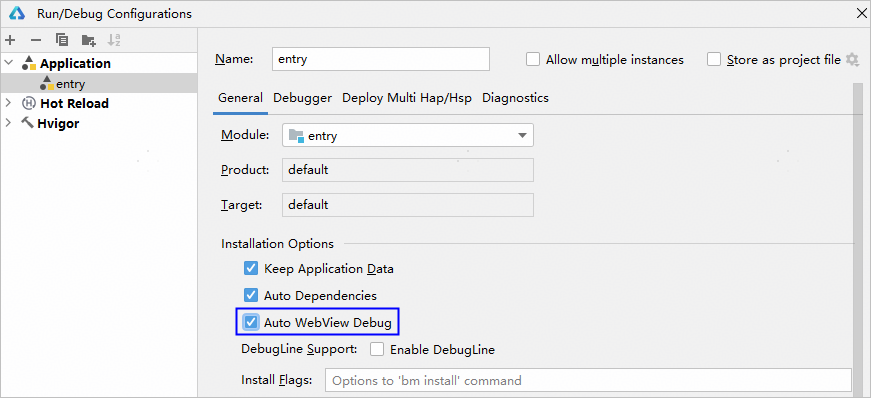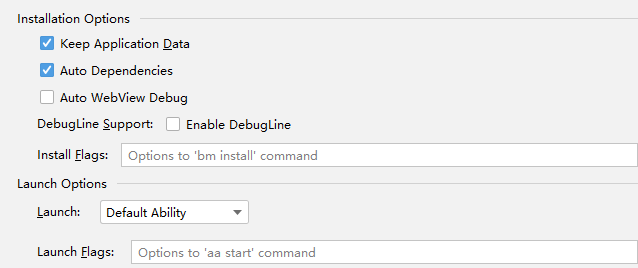 如果未进行自定义,将按默认配置安装和运行应用。如果开发者需要对应用安装、运行等流程增加参数配置,可在“Installation Options”和“Launch Options”下进行配置。