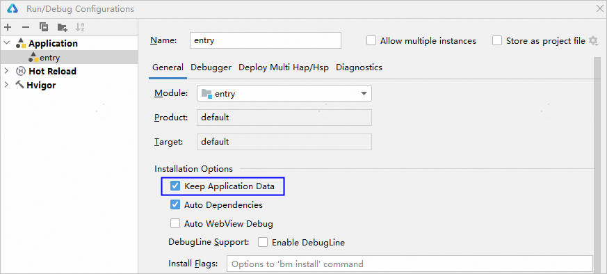 单击Run > Edit Configurations,设置指定模块的HAP安装方式,勾选Keep Application Data,则表示采用覆盖安装方式,保留应用/元服务缓存数据。