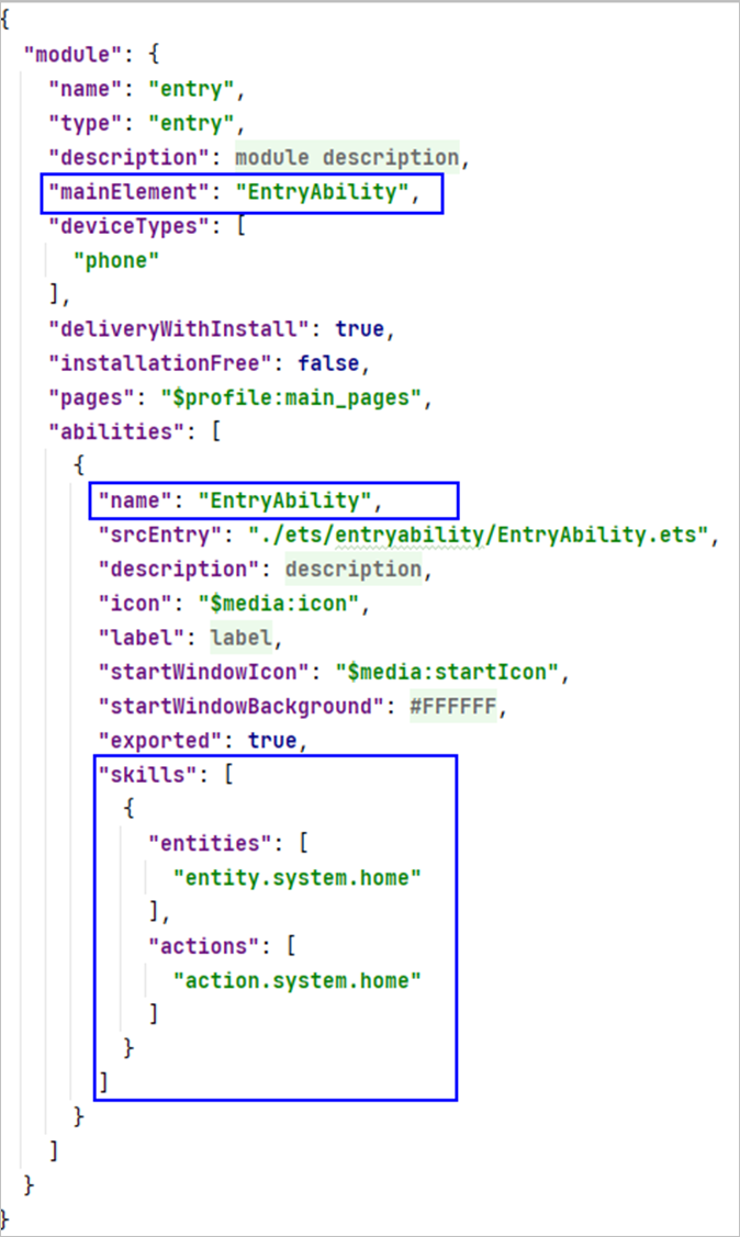Stage模型:module.json5文件中配置了“skills”属性的第一个ability;若无配置“skills”属性的ability,则取“mainElement”指定的ability(该ability需存在于“abilities”数组内);若“mainElement”未指定,则取“abilities”数组内的第一个ability。