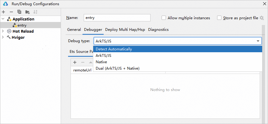 | Detect Automatically | 新建工程默认调试器选项。根据工程模块及其依赖的模块涉及的编程语言,自动启动对应的调试器。 |