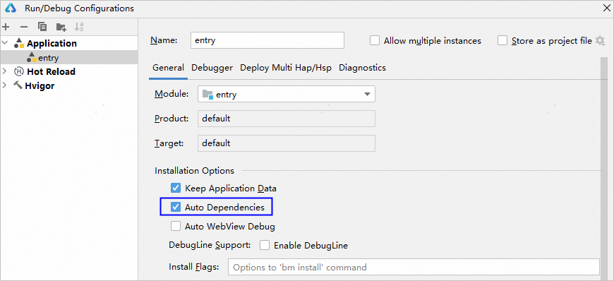 如果一个工程中entry/feature/HSP模块直接依赖其他HAR/HSP模块(如entry模块依赖HSP模块)及间接依赖其他模块(如entry模块依赖HAR模块,HAR又依赖HSP模块)时,在调试阶段需要同时安装模块包及其所有依赖模块的包到设备中。此时,可以设置Auto Dependencies,启动调试时会自动将所有依赖的模块都安装到设备上。