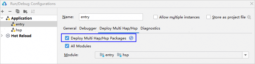 如果一个工程中同一个设备存在多个模块(如存在entry和feature模块),且存在模块间的调用时,在调试阶段需要同时安装多个模块的Hap包到设备中。此时,需要在Deploy Multi Hap********/Hsp中选择多个模块,启动调试时,DevEco Studio会将所有的模块都安装到设备上。