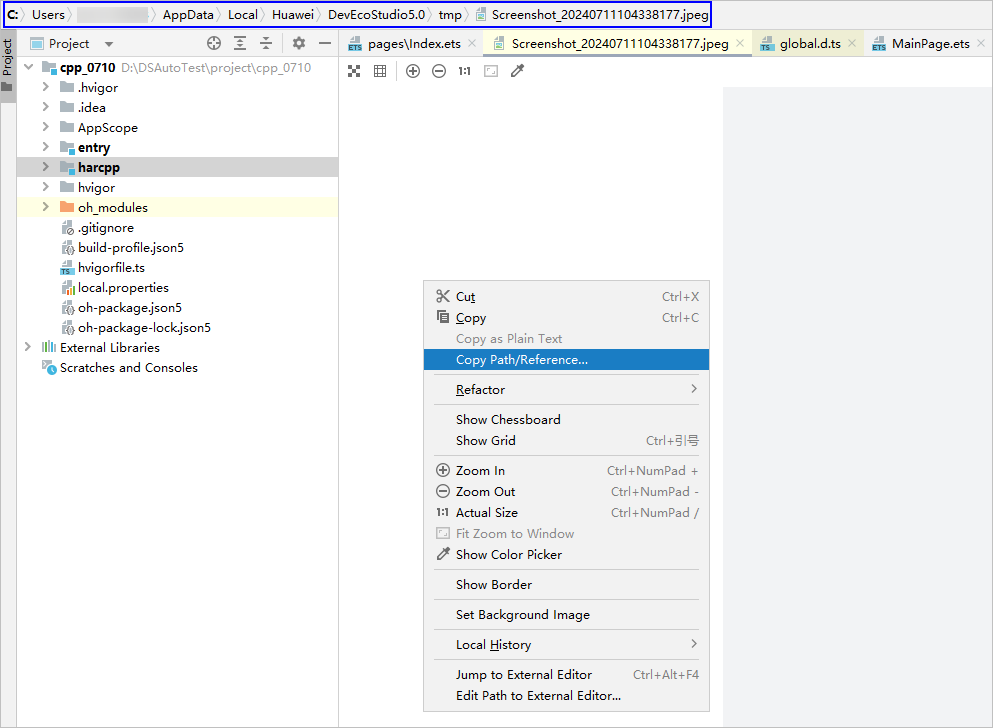 (可选)在图片显示区域右击,选择****Copy Path/Reference...****可以查看截屏的本地存储路径或者在菜单栏下方查看本地存储路径。