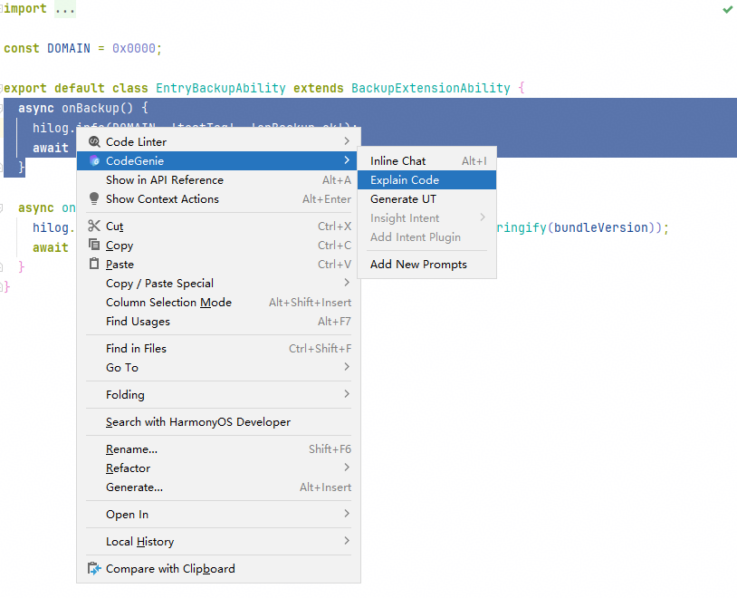 选中.ets文件或者.cpp文件中需要被解释的代码行或代码片段,右键选择CodeGenie > Explain Code,开始解读当前代码内容。