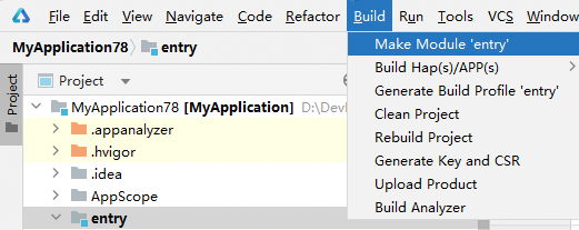 如果您想将某个模块下的指定target打包生成HAP,可以在工程目录中,单击模块名,然后再单击Build > Make Module ‘模块名 ’,此时DevEco Studio将构建生成模块下指定target对应的包。例如,按照上述配置,此时DevEco Studio将构建生成entry模块下free的HAP。