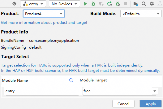 单击右上角的图标,指定需要打包的Product及Target,然后单击Apply保存。例如选择"ProductA"中,entry模块对应的"free" Target。