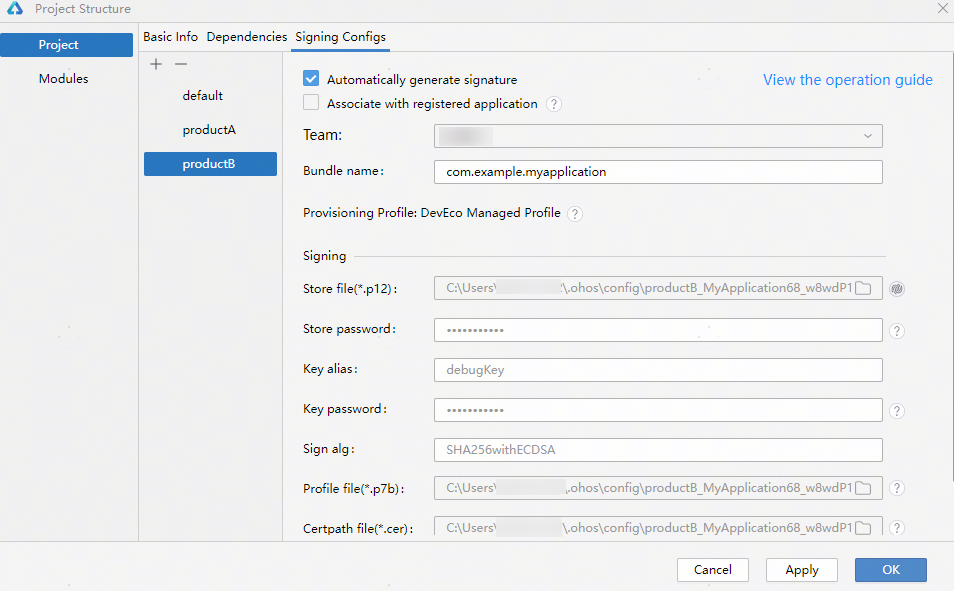 通常情况下,您首先需要在签名配置界面或工程的build-profile.json5文件中配置签名信息。例如在File > Project Structure > Project > Signing Configs界面,分别配置default、productA和productB的签名信息,如下图所示:
