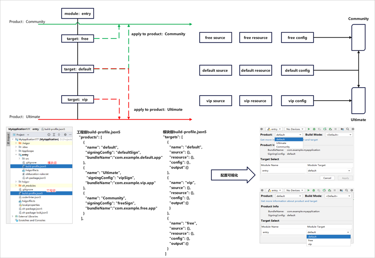 - 两个不同版本的软件,可能存在差异:如不同的应用标题、应用图标、版本声明。我们可以在工程级build-profile.json5->app{}->products[]中,可以对两种不同的外发版本进行差异化定制,新增两个product:Community和Ultimate。根据已支持的字段进行定制修改。