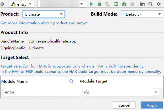例:用户需要构建Ultimate版本的且具有vip特性的应用,可以选择product:Ultimate,target:vip,apply之后执行构建。
