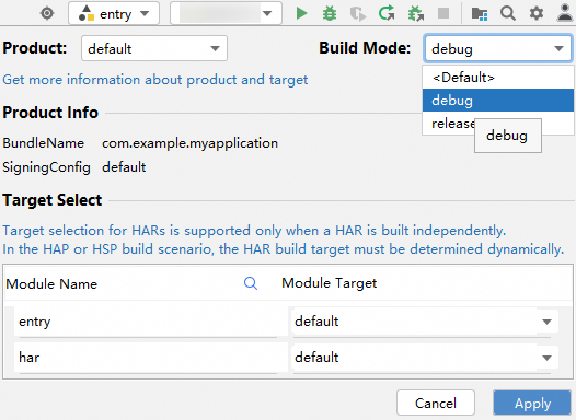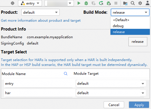 ,Build Mode中选择****release。默认为<Default>****模式:在编译App时使用release模式,编译HAP/HSP/HAR时使用debug模式。