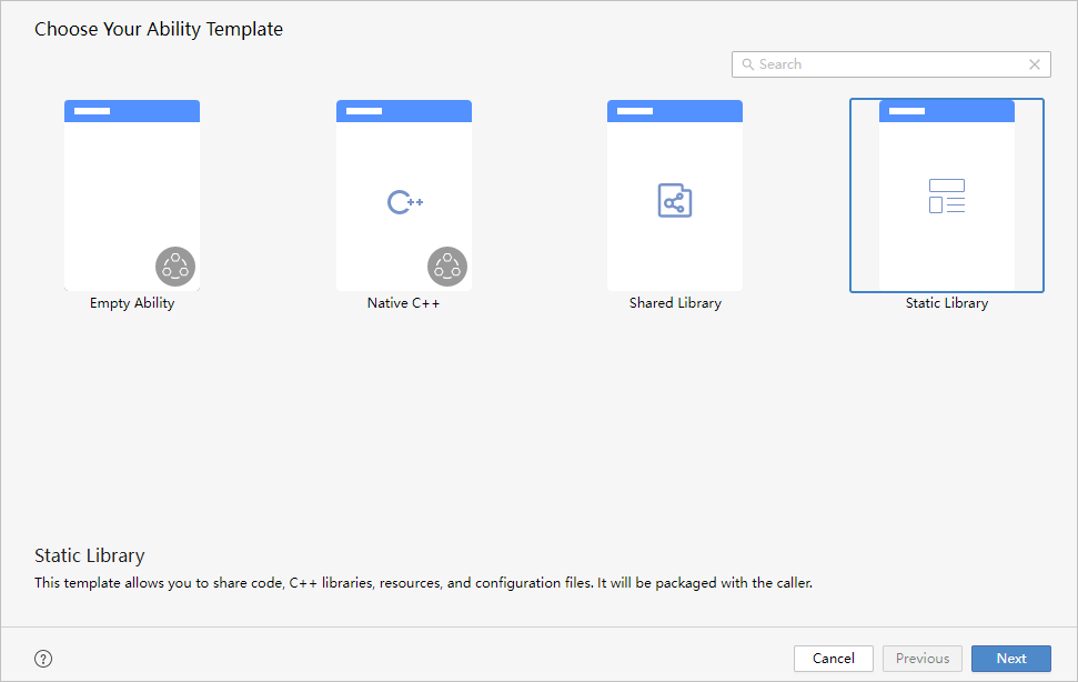 新建工程时选择API 10及以上的Stage模型,工程创建完成后,新建“Static Library”模块。模块创建方法可参考在工程中添加Module。