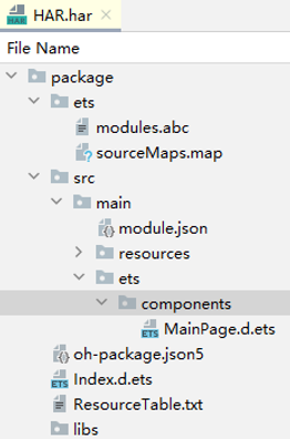 library // HAR根目录├─libs // 存放用户自定义引用的Native库,一般为.so文件└─src│ └─main│ ├─cpp│ │ ├─types // 定义Native API对外暴露的接口│ │ │ └─liblibrary│ │ │ ├─index.d.ts│ │ │ └─oh-package.json5│ │ ├─CMakeLists.txt // CMake配置文件│ │ └─napi_init.cpp // C++源码文件│ └─ets // ArkTS源码目录│ │ └─components│ │ └─MainPage.ets│ ├─resources // 资源目录,用于存放资源文件,如图片、多媒体、字符串等│ └─module.json5 // 模块配置文件,包含当前HAR的配置信息├─build-profile.json5 // Hvigor编译构建所需的配置文件,包含编译选项├─hvigorfile.ts // Hvigor构建脚本文件,包含构建当前模块的插件、自定义任务等├─Index.ets // HAR的入口文件,一般作为出口定义HAR对外提供的函数、组件等└─oh-package.json5 // HAR的描述文件,定义HAR的基本信息、依赖项等 -