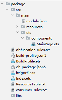 在oh-package.json5中“main”字段定义导出文件入口。若不设置“main”字段,默认以当前目录下Index.ets为入口文件,依据.ets>.ts>.js的顺序依次检索。以将ets/components/MainPage.ets文件设置为入口文件为例: