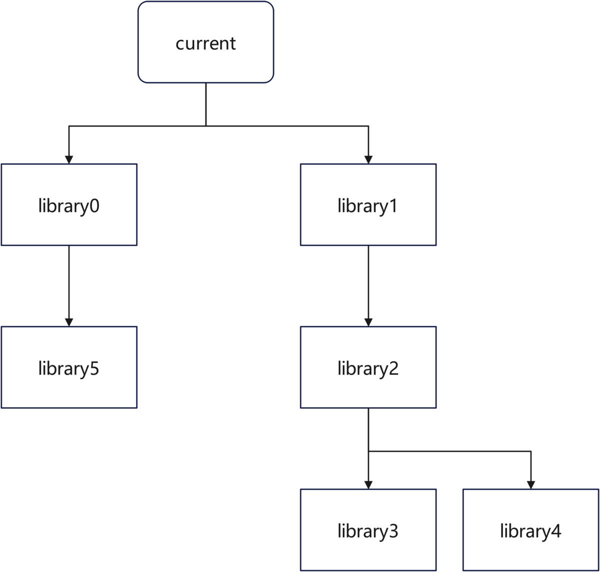 按照广度优先的遍历方式来收集依赖,如下图,优先级顺序为current > library0 > library1 > library5 > library2 > library3 > library4。