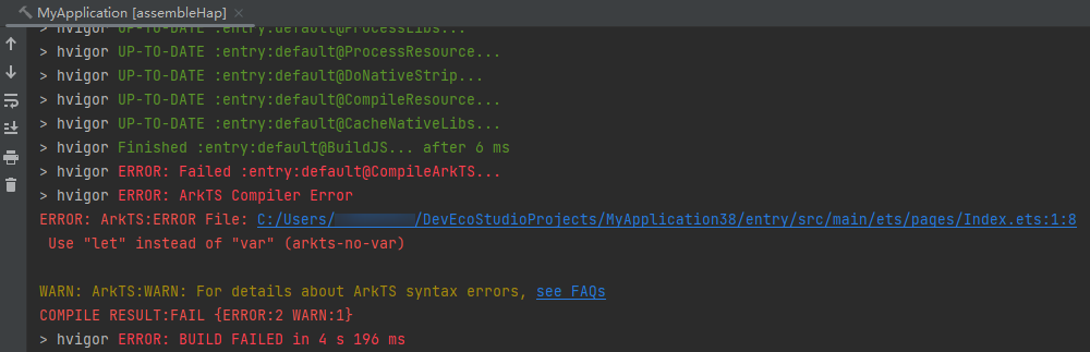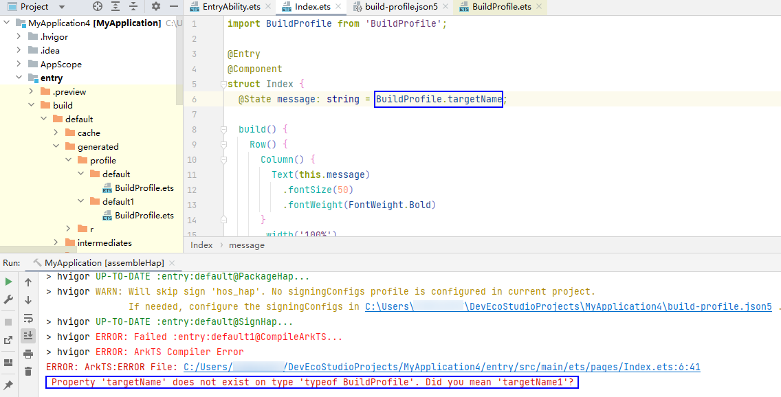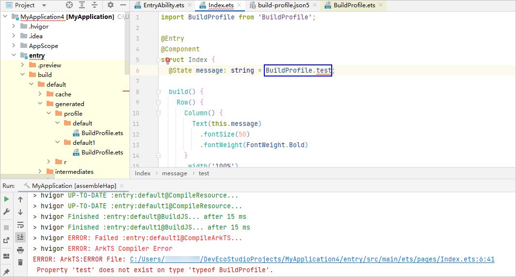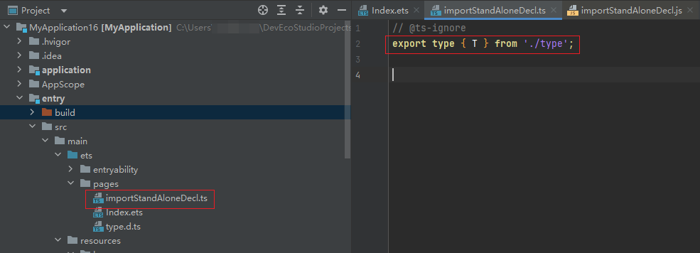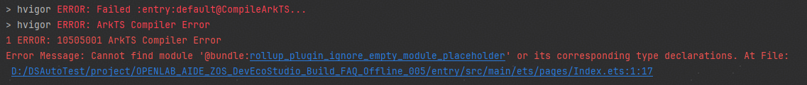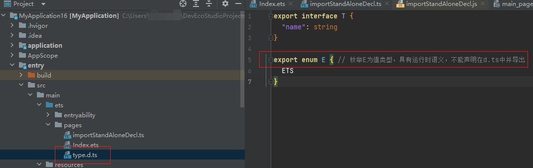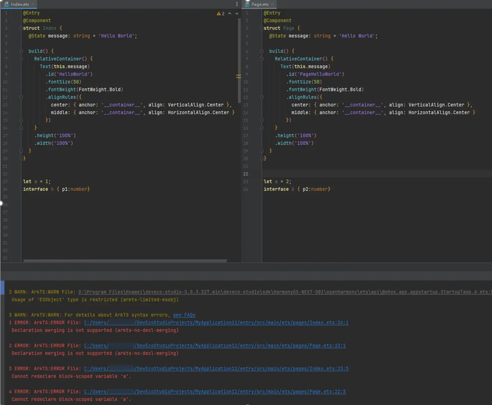 在不同的文件中声明相同变量或者interface、enum等类型,DevEco Studio不报错,但是编译报错。