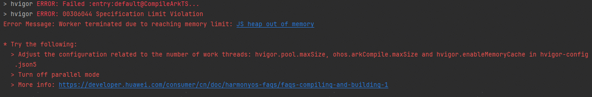 "properties": {// 配置为0,表示不启用内存缓存配置,默认为4,数值越低,内存中缓存数据越少"hvigor.pool.cache.capacity": 0,// 默认配置为cpu核数-1, 包含ohos.arkCompile.maxSize,值越小,占用内存越少"hvigor.pool.maxSize" : 5,// 默认配置值为5, 值越小,占用内存越少"ohos.arkCompile.maxSize": 3,// 默认配置值为true, 表示开启内存缓存,占用内存较多,配置为false,关闭内存缓存,占用内存较少"hvigor.enableMemoryCache": false},当配置项"hvigor.pool.maxSize"和"ohos.arkCompile.maxSize"的值改小,"hvigor.enableMemoryCache"改为false后,可能会导致编译时长增加,请耐心等待。
