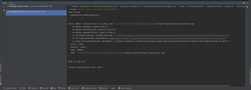 在升级DevEco Studio至5.0.3.403版本后,打开旧工程概率性报错:resource busy or locked, open 'xxx\outputs\build-logs\build.log'。